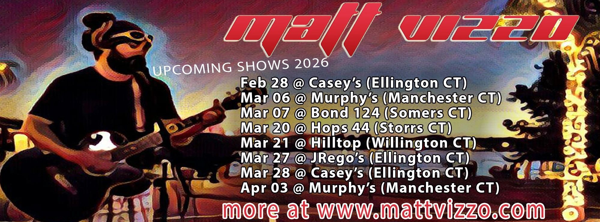 Matt Vizzo is a Connecticut native who has spent most of his life fronting rock, metal, and reggae bands as well as rap, hip-hop, and electronic music acts in South Florida and Argentina… some with major label affiliation. These days, Matt spends most of his time in New England and continues to bring quality music entertainment to parties and venues with his Solo and Duo Acoustic, Cover Band, DJ, and other musical acts and services.