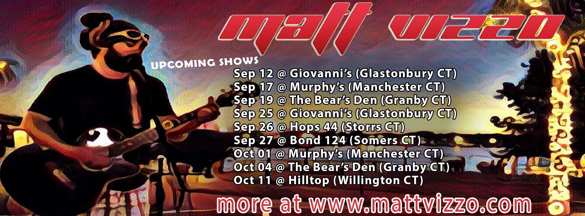 Matt Vizzo is a Connecticut native who has spent most of his life fronting rock, metal, and reggae bands as well as rap, hip-hop, and electronic music acts in South Florida and Argentina… some with major label affiliation. These days, Matt spends most of his time in New England and continues to bring quality music entertainment to parties and venues with his Solo and Duo Acoustic, Cover Band, DJ, and other musical acts and services.